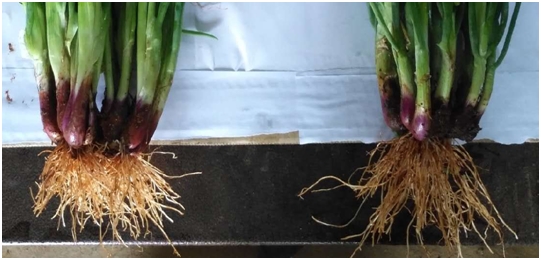 歷經(jīng)54天,紅蔥示范田長勢良好,示范地塊植株整齊,大小均勻,根系發(fā)達并且旺盛,葉片顏色深,品相較好,通過統(tǒng)計植株高度平均在30-36cm,每棵紅蔥平均分蘗15個蔥頭左右,相比對比地塊平均多出4個蔥頭左右,畝產(chǎn)量2.3噸,相較于本地紅蔥同期產(chǎn)量要高出400-500KG!